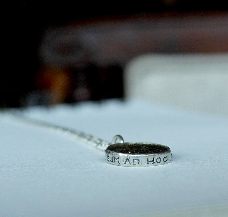 Joan of Arc pendant with the legendary quote I was born to do this handwritten in Latin encompassing the pendant.